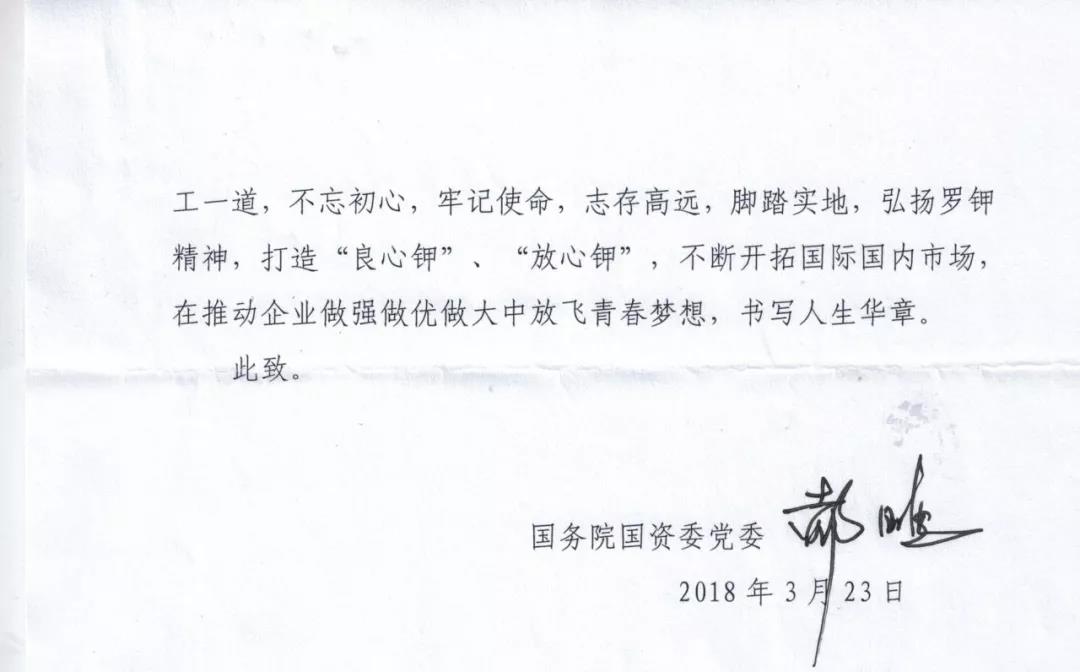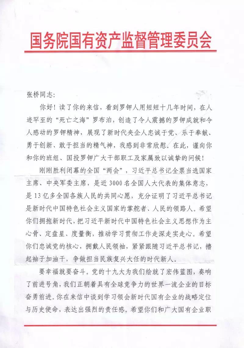 我是國投新疆羅布泊鉀鹽有限責任公司的一名普通的85后員工。前幾天,通過“國資小新”微信看到了您在接受《求是》雜志專訪的《新時代國有企業(yè)的戰(zhàn)略定位與歷史使命》文章,受益匪淺。您的思考,通篇貫徹著習近平新時代中國特色社會主義思想,為我們講述了新時代國有企業(yè)的戰(zhàn)略定位、歷史使命和改革發(fā)展的新目標新舉措,不僅解開了我們基層員工的一些思想困惑,也指明了我們國企未來的發(fā)展方向。所以,就想通過寫信的方式和您交流一下學習心得。