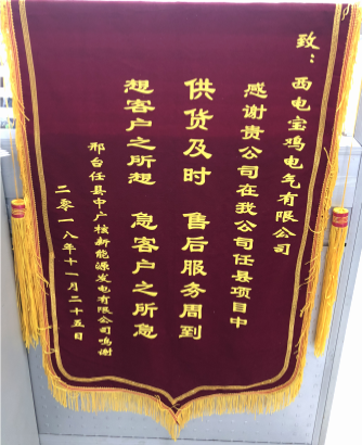 12月6日,西電寶雞電氣收到邢臺(tái)任縣中廣核新能源發(fā)電有限公司贈(zèng)送的錦旗,感謝公司優(yōu)質(zhì)履約邢臺(tái)任縣風(fēng)電場(chǎng)一期高低壓柜項(xiàng)目,贊譽(yù)西電寶雞電氣在該項(xiàng)目上“供貨及時(shí)、售后服務(wù)周到、想客戶之所想、急客戶之所急” 。