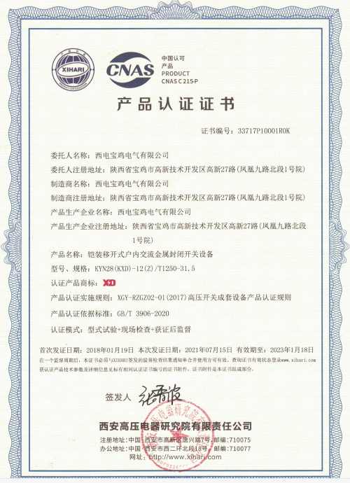 經過前期現(xiàn)場審核、不符合項的糾正、糾正資料提交、書面不符合項糾正驗證、認證公司的審查、批準、制證等多個環(huán)節(jié),近日,西電寶雞電氣KYN28(KXD)-12(Z)/T1250-31.5鎧裝移開式戶內交流金屬封閉開關設備取得了新版標準GB/T3906-2020產品認證證書,至此公司順利通過了西高院自愿性產品認證年度監(jiān)督審核和KYN28(KXD)-12(Z)/T1250-31.5開關柜標準換版認證工作,為公司產品的銷售、市場開拓提供有力支持。