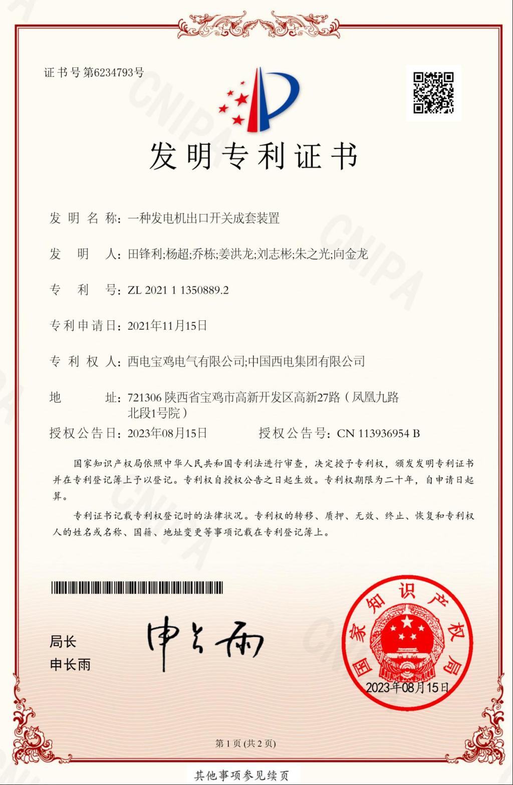 日前,由西電寶雞電氣自主研發(fā)的“一種發(fā)電機出口開關(guān)成套裝置”的發(fā)明專利,順利通過國家知識產(chǎn)權(quán)局審查,并獲得國家發(fā)明專利授權(quán),這是西電寶雞電氣完全自主研發(fā)獲得的首個專利,成為西電寶雞電氣科技創(chuàng)新能力發(fā)展的又一重要里程碑,標志著向科技強企邁出扎實的一步。