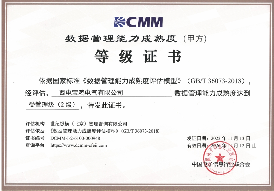 數(shù)據(jù)管理能力成熟度模型(Data Capability Maturity Model簡(jiǎn)稱DCMM)(GB/T36073-2018),是我國(guó)在數(shù)據(jù)管理領(lǐng)域正式發(fā)布的首個(gè)國(guó)家標(biāo)準(zhǔn)。西電寶雞電氣參照GB/T36073-2018《數(shù)據(jù)管理能力成熟度評(píng)估模型》的8個(gè)數(shù)據(jù)管理能力域,從數(shù)據(jù)戰(zhàn)略、數(shù)據(jù)治理、數(shù)據(jù)架構(gòu)、數(shù)據(jù)應(yīng)用、數(shù)據(jù)安全、數(shù)據(jù)質(zhì)量、數(shù)據(jù)標(biāo)準(zhǔn)和數(shù)據(jù)生存周期進(jìn)行數(shù)據(jù)管理體系建設(shè),取得了DCMM等級(jí)證書。