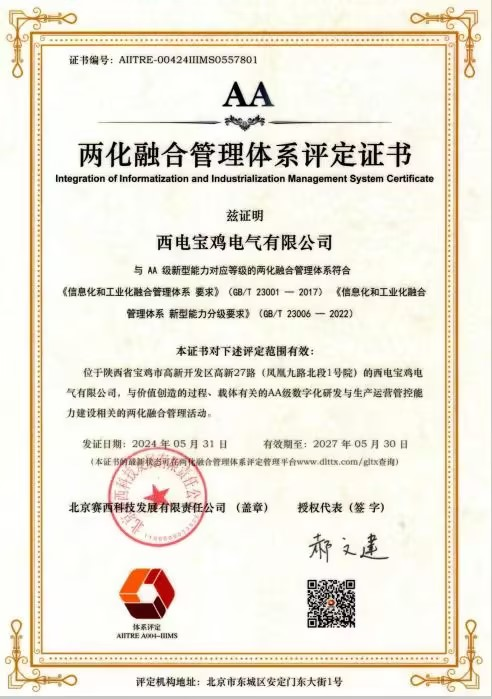 近日,西電寶雞電氣通過工業(yè)和信息化部《信息化和工業(yè)化融合管理體系要求》及《信息化和工業(yè)化融合管理體系新型能力分級要求》體系認(rèn)證審核,取得兩化融合管理體系“AA”級認(rèn)證證書,標(biāo)志著西電寶雞電氣在推進(jìn)“信息化”和“工業(yè)化”深度融合方面獲得國家最權(quán)威認(rèn)可,彰顯了企業(yè)在兩化融合方面取得新的突破。