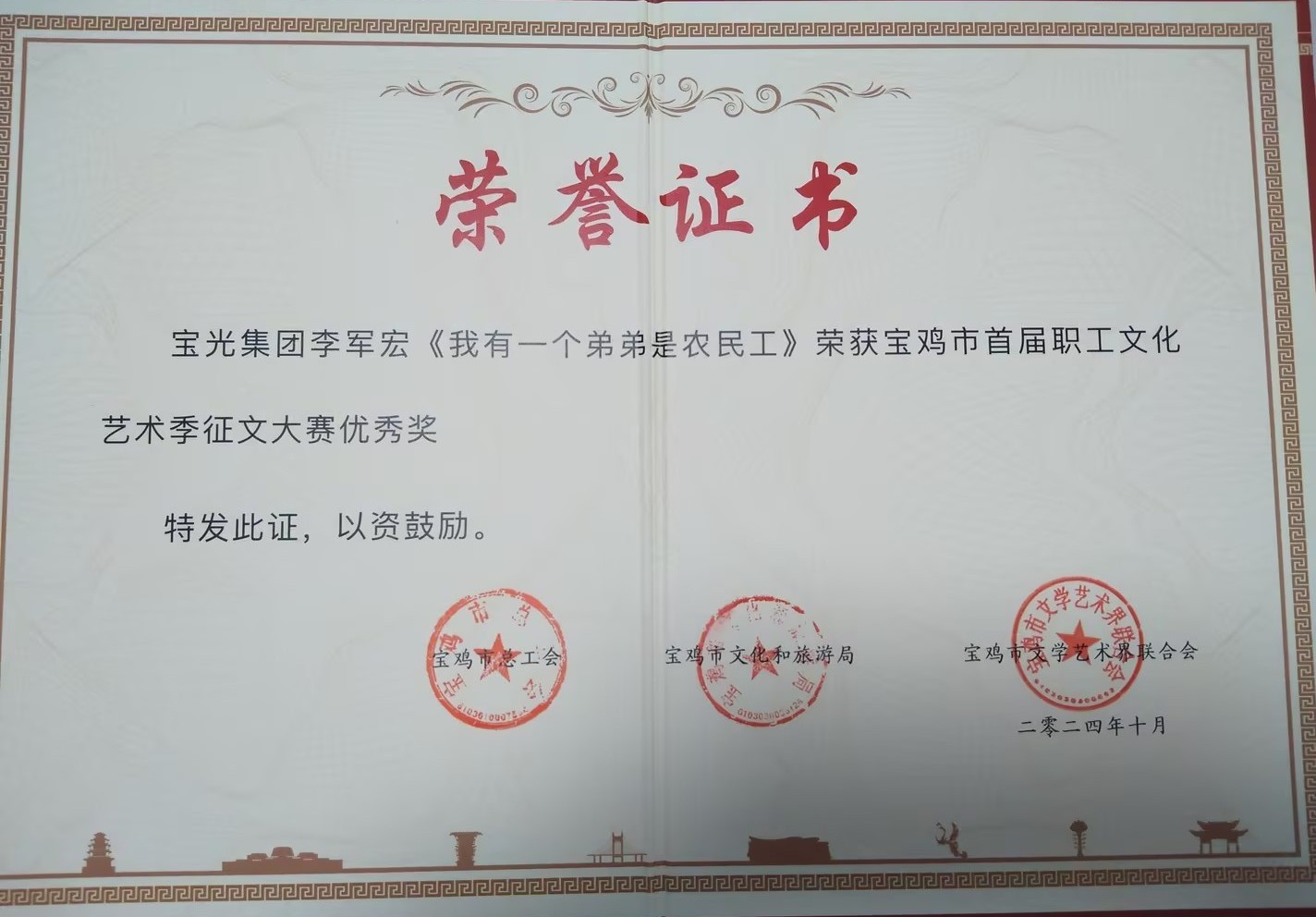 由寶雞市總工會(huì)、寶雞市文旅局、寶雞市文學(xué)藝術(shù)界聯(lián)合會(huì)主辦,寶雞市工人文化宮承辦的“中國夢.勞動(dòng)美——凝心鑄魂跟黨走 團(tuán)結(jié)奮斗新征程”首屆寶雞市職工文化藝術(shù)季。西電寶雞電氣李軍宏在征文大賽中表現(xiàn)出色,散文《我有一個(gè)弟弟是農(nóng)民工》在500多篇征文中脫穎而出,榮獲優(yōu)秀獎(jiǎng),這是個(gè)人的實(shí)力,也是企業(yè)的榮譽(yù)。